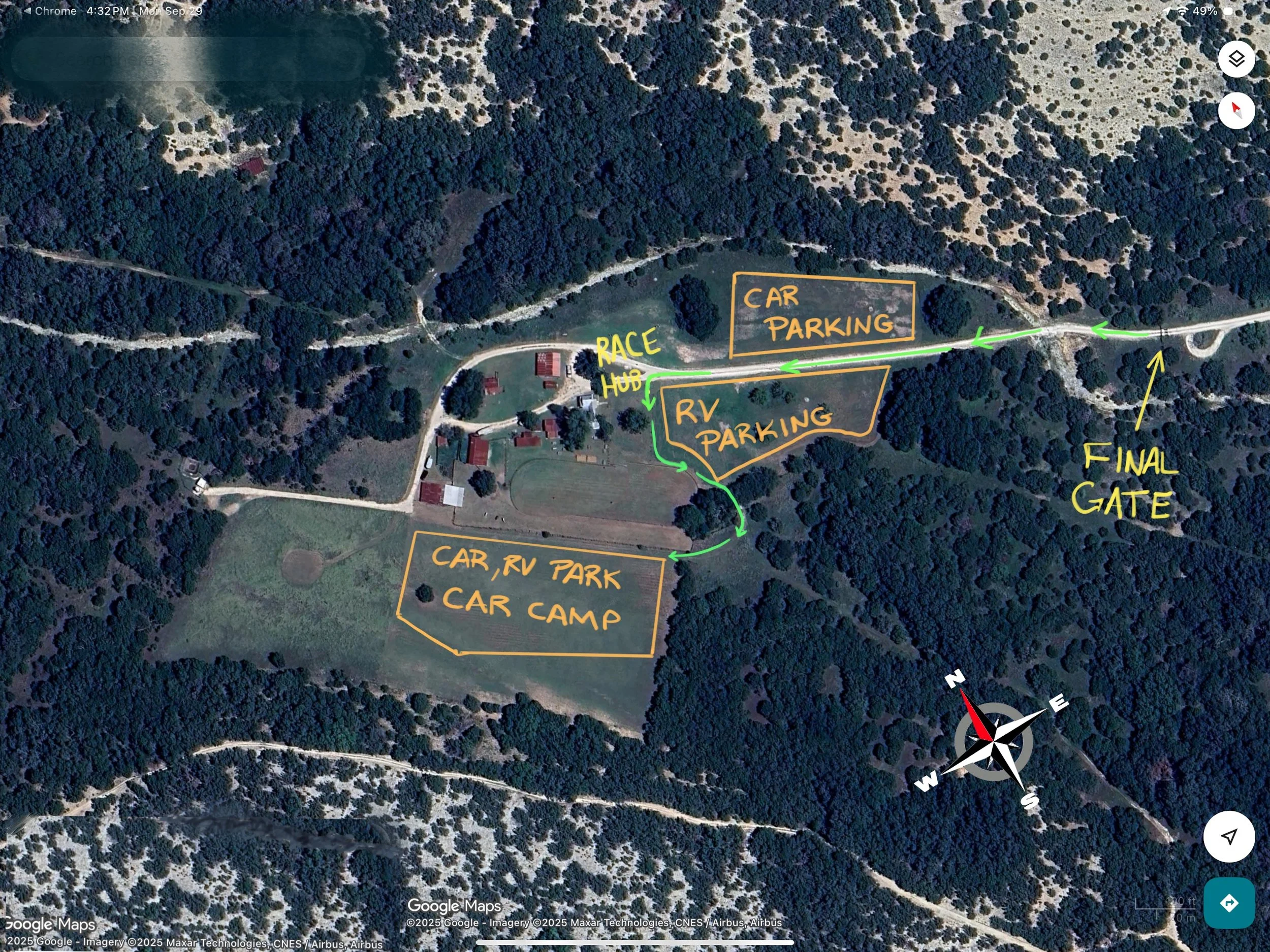 There is a larger field behind the previously described field and the corral, on your left. Drive through the gate around the near side of the corral, and find a spot back there. Same thing, please begin a new straight line for parking. Tents need to be placed around the perimeter. No tents are allowed in the parking lanes. Packet Pickup will be in the open face barn or front porch of the old house. Either way, in plain sight around the old historic ranch house.